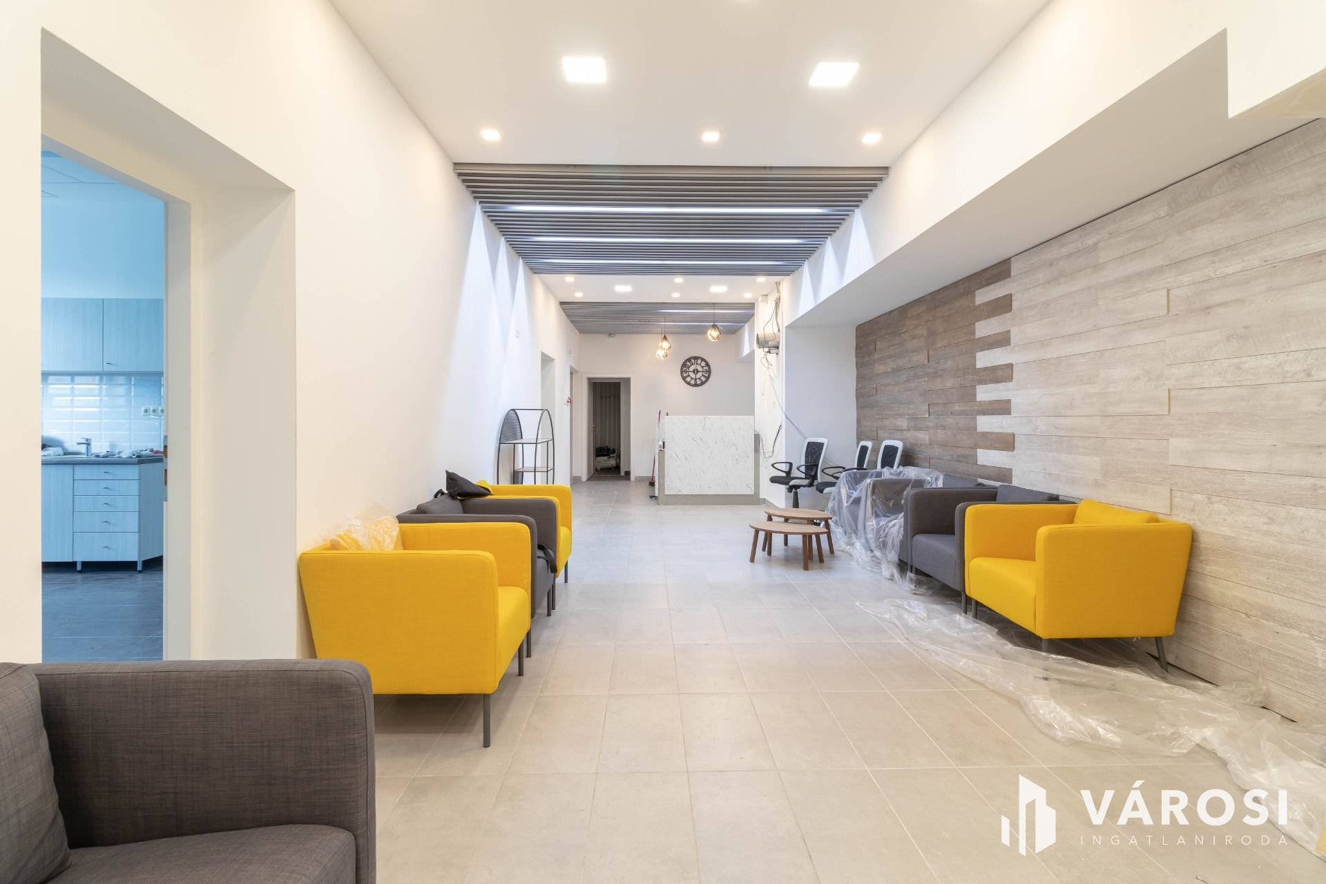 A rendelő – az alaprajz szerinti elrendezésben – tágas, igényes, mosdóval is rendelkező váróból nyílik, ahol recepciós pult is található.