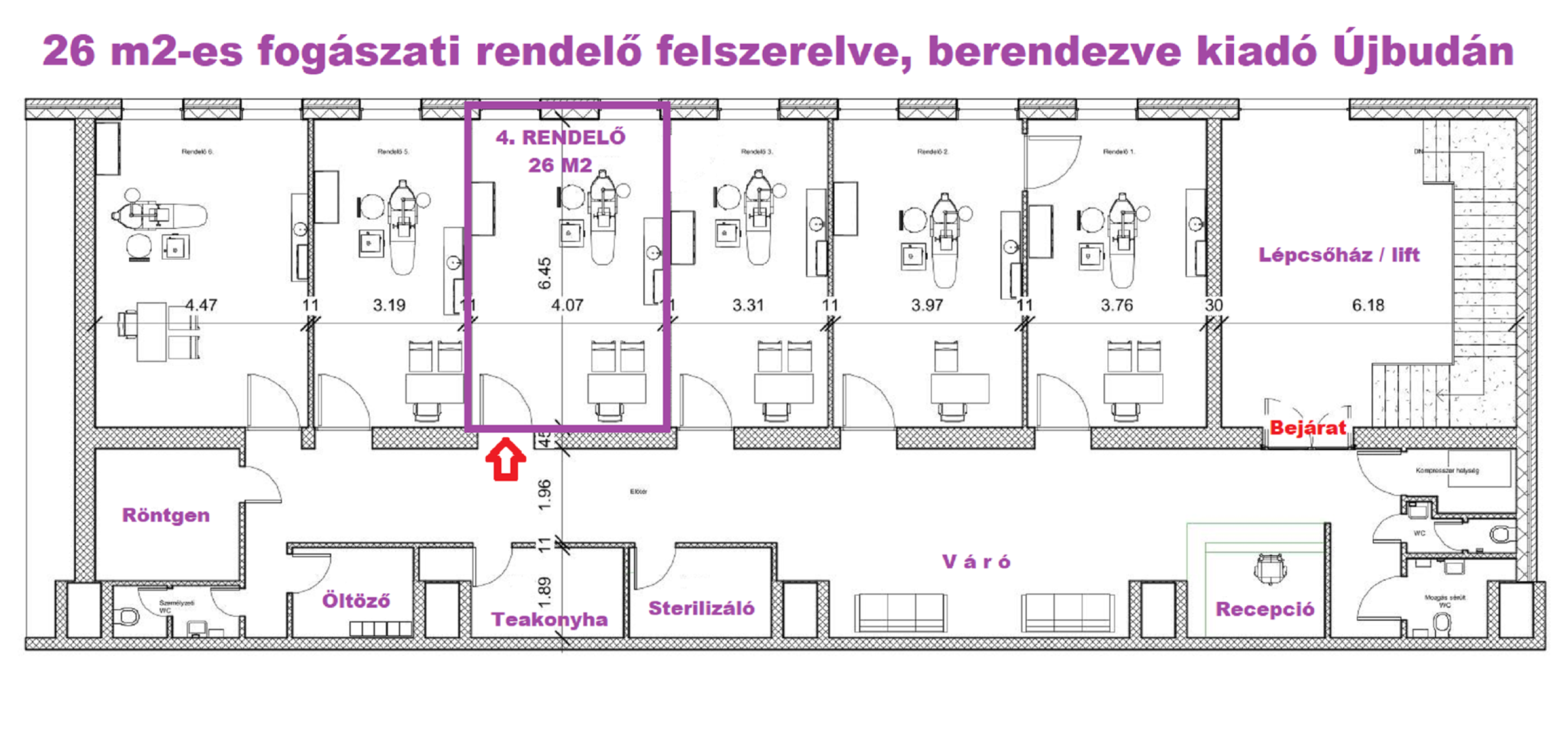 A komplexumban egymás mellett 6 rendelő kiadó, ez a rendelő 26 m2 alapterületű, teljesen felszerelt, Optimal 09 kezelőegységgel, fogászati eszközökkel és rendelői bútorzattal ellátott.