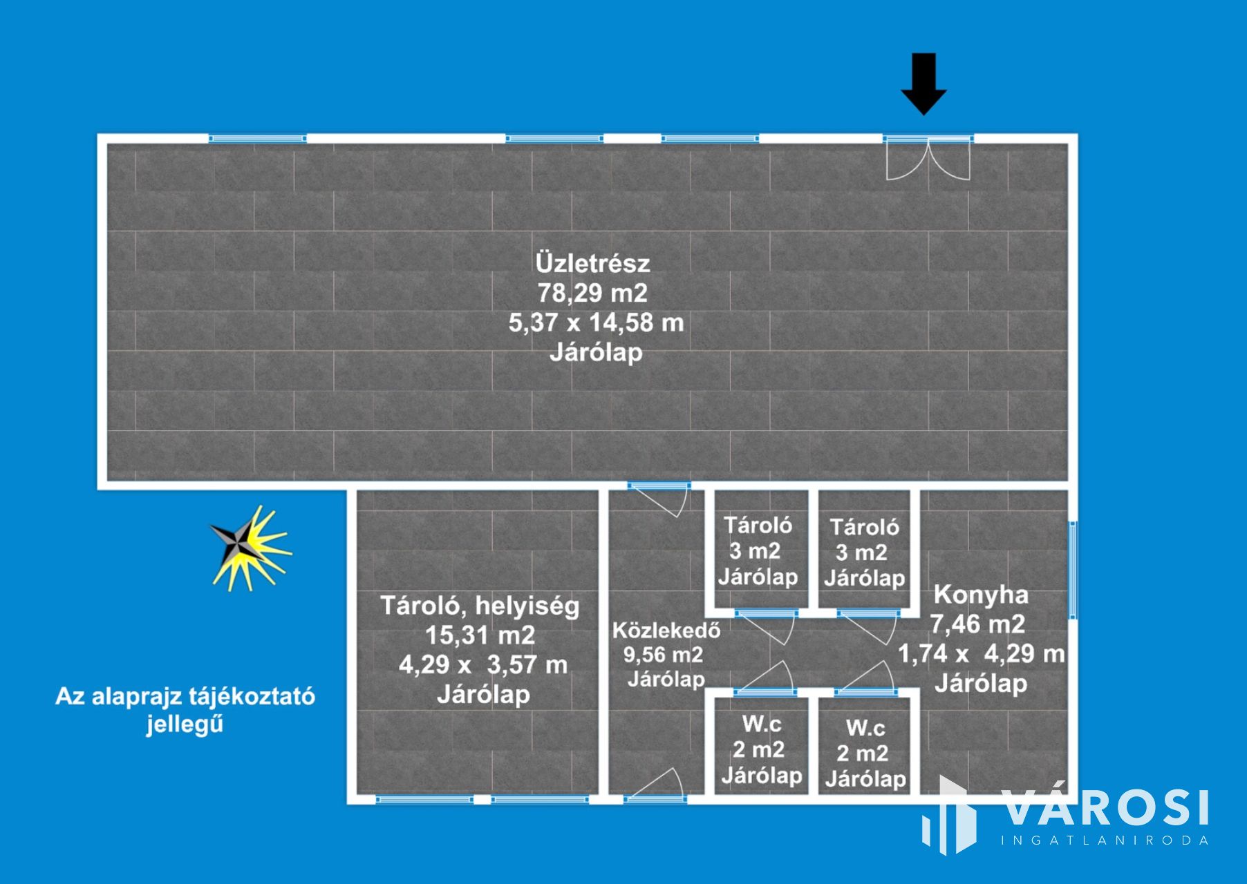 Az üzlethelyiség 1 db óriási üzletrésszel, 1 db helyiséggel (irodarész tároló), 2 db külön Wc-vel, közlekedővel, konyharésszel rendelkezik. Az ingatlan elhelyezkedésre, kialakítása miatt rendkívül sokrétű a felhasználása, amely maximálisan kiemeli ezt az ingatlant az átlagos üzlethelyiségek sorából és egyedülálló választássá teszi azt.