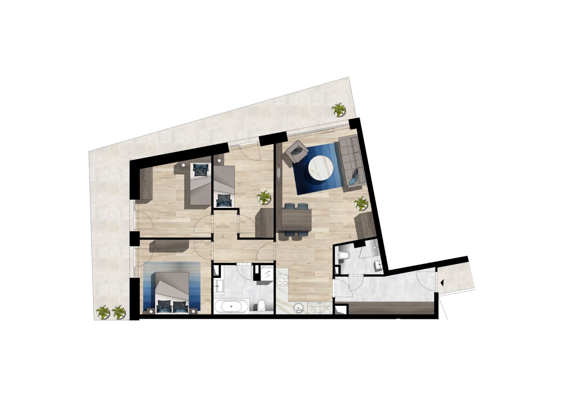 A lakás az 1. emeleten található, nappali+3 hálószobás, 86,87 m²-es. Minden szobából közvetlenül megközelíthető a 31,72 m²-es terasz.