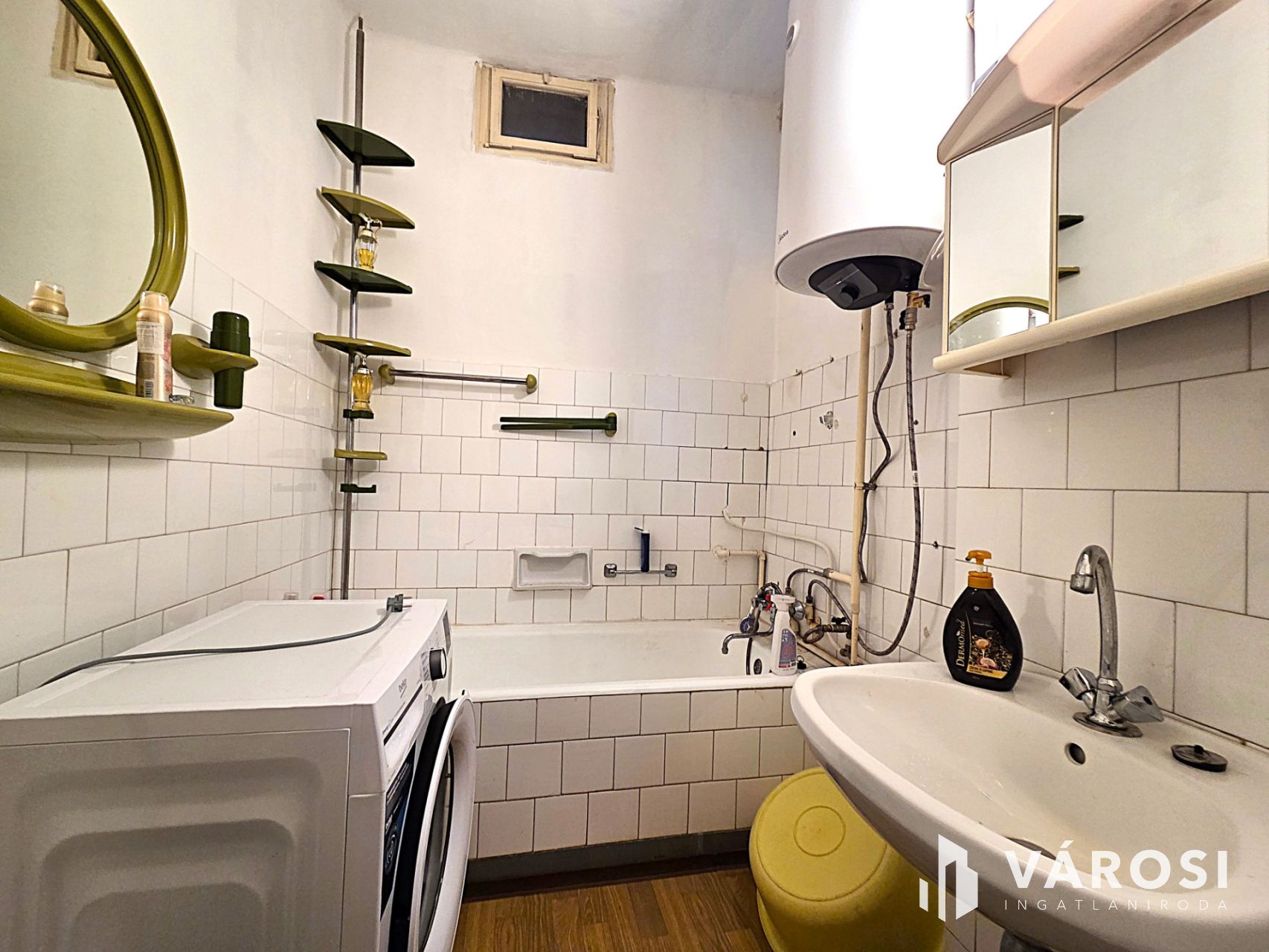 A fürdőszobában a régi gázüzemű vízmelegítő helyett már új elektromos vízmelegítő berendezés üzemel.