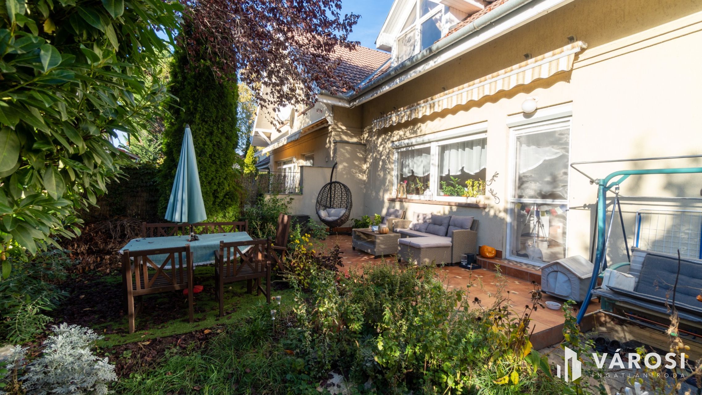A gondozott, zöld növényekkel és árnyékot adó fákkal szegélyezett kert ideális pihenésre vagy családi kikapcsolódásra.