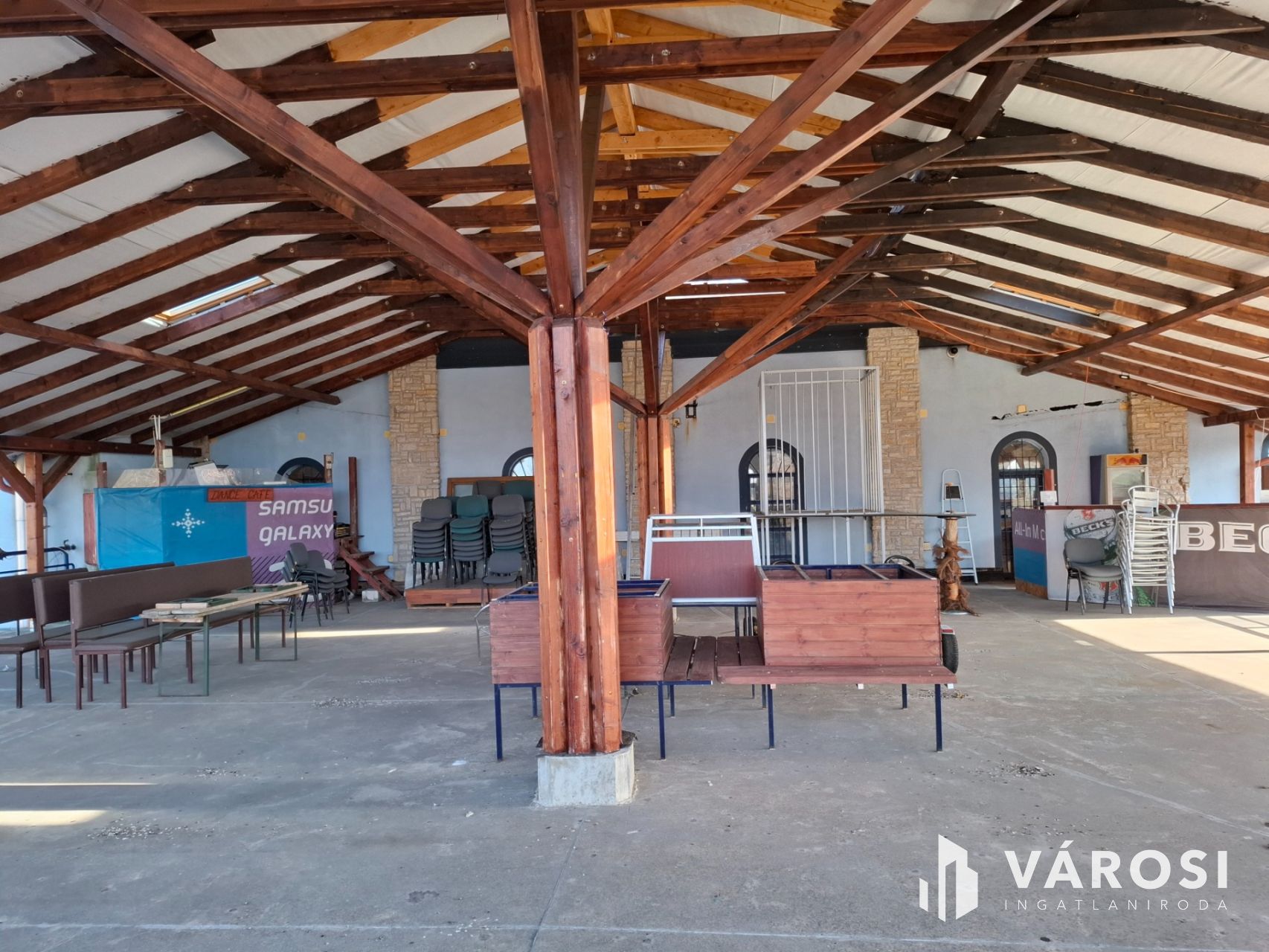 A területen található két szintes épületet szilárd burkolatú parkoló veszi körül. Az épület teljesen működőképes belső térrel rendelkezik, zenés-táncos vendéglátó hely. A helyszín magában foglal egy 400 négyzetméteres nagytermet, egy 100 négyzetméteres kistermet, színpadot és kapcsolódó helyiségeket, öltözőket, valamint egy 200 négyzetméteres fedett teraszt, melynek fagerendás tetőszerkezete 3 éve készült.