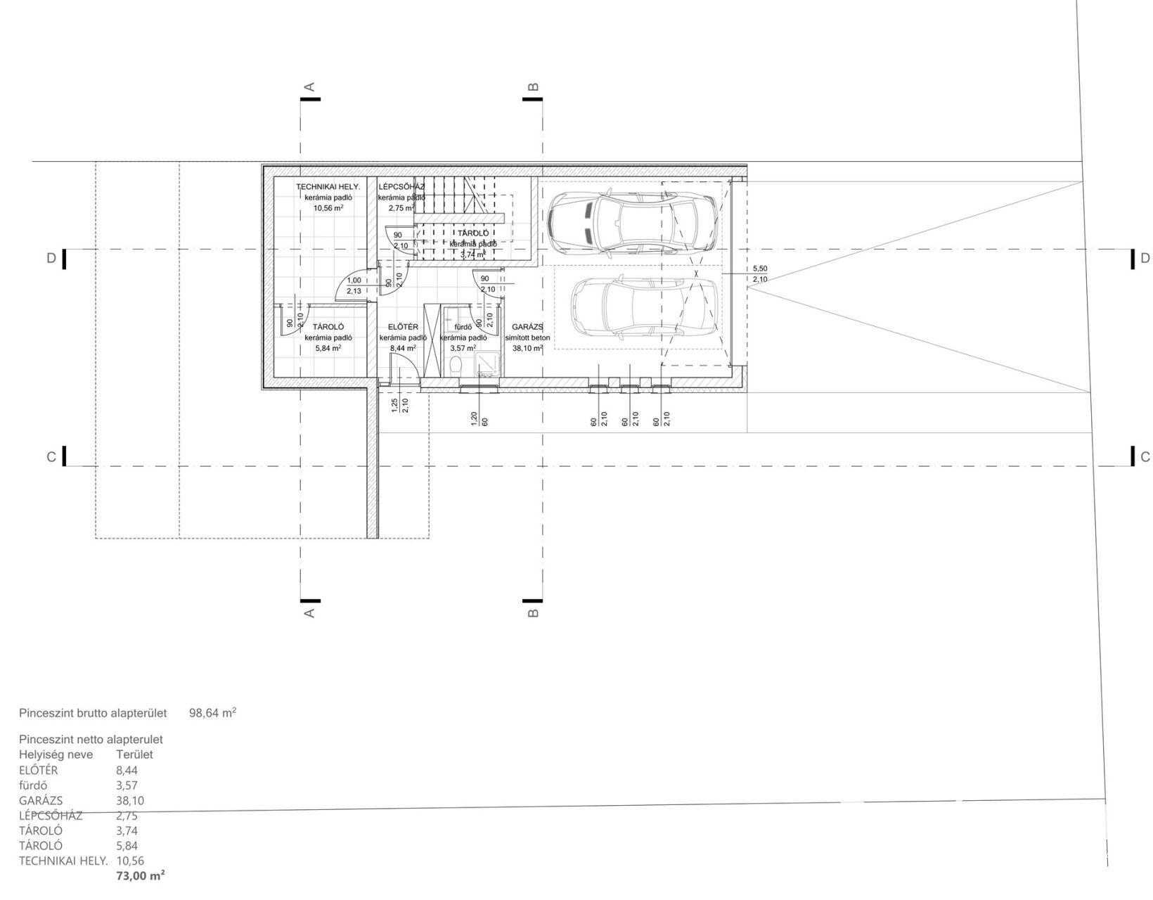 Alsó szinten kialakításra került, egy 38 m²-es dupla garázs, előtér, fürdő, két tároló, valamint a hőszivattyús fűtési és meleg víz ellátást biztosító gépészeti helyiség.